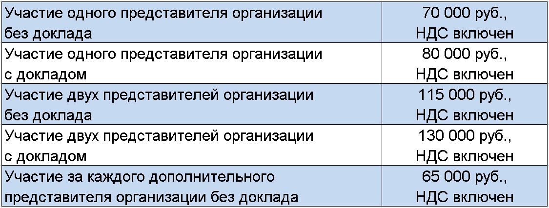 Стоимость участия включает в себя организационное обеспечение совещания, аренду зала и демонстрационную технику, чайно-кофейные паузы, питание, товарищеский ужин, подготовку электронного сборника докладов и его рассылку участникам.
