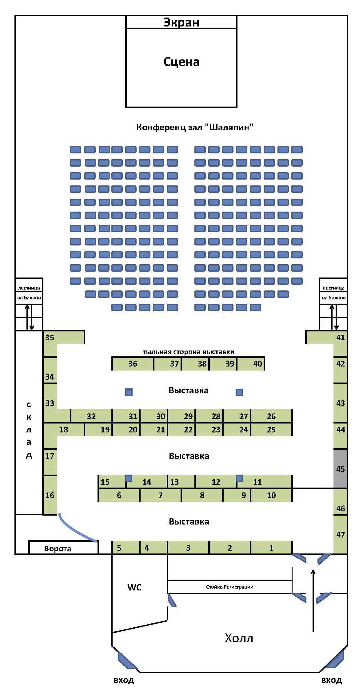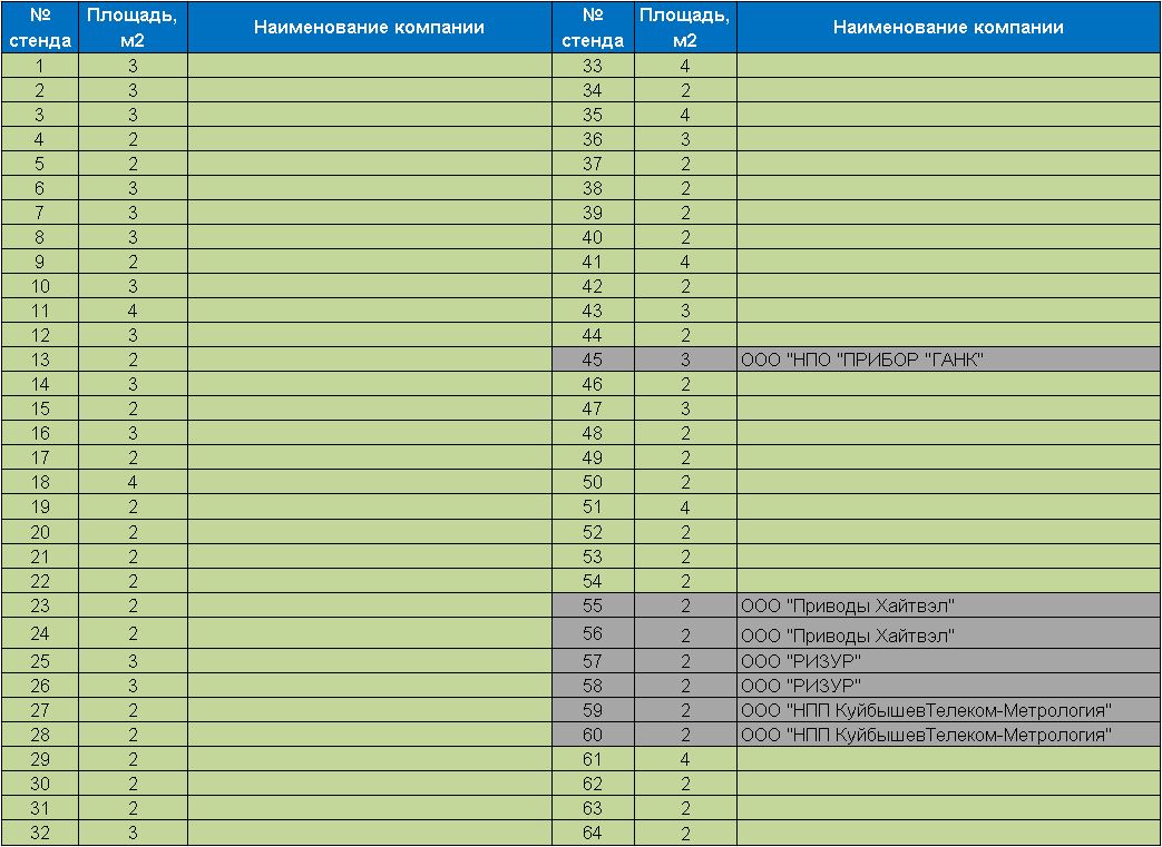 В ходе Совещания состоится выставка. Стоимость выставочной площади – 30000 руб. за 1 м2. (Возможно объединение стендов, стоящих рядом или "спиной к спине", например, №2 + №3 или № 22 + 29)